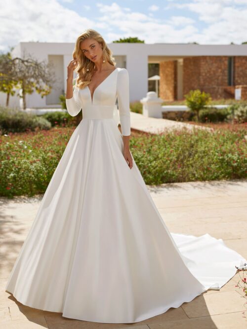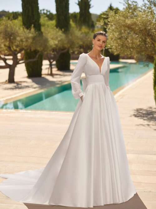 El vestido Zuley de Adriana Alier es un diseño de estilo clásico con una silueta en A, confeccionado en raso texturizado. Su escote deep plunge añade un punto de modernidad, mientras que la espalda en U con lazo aporta un detalle romántico y delicado. Los bolsillos laterales añaden funcionalidad sin restar elegancia, y la cola catedral independiente completa un conjunto majestuoso que combina sencillez y sofisticación.