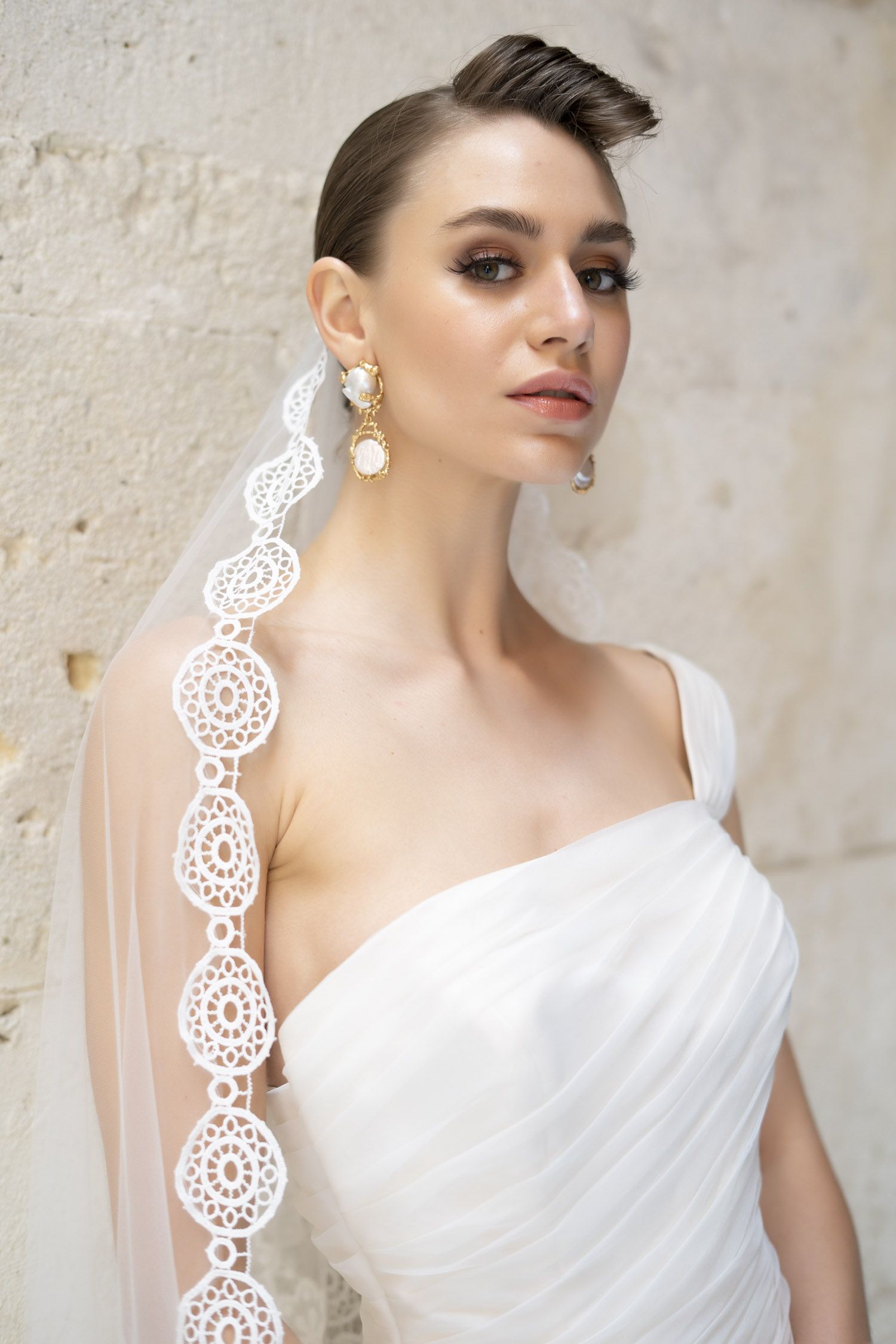 Vestido de organza de seda en blanco roto, con drapeado en el cuerpo, un solo tirante opcional y volantes pequeños desde la cadera, que le dan un carácter muy especial al vestido de novia , haciéndolo combinable con cualquier tipo de velo o mantilla.