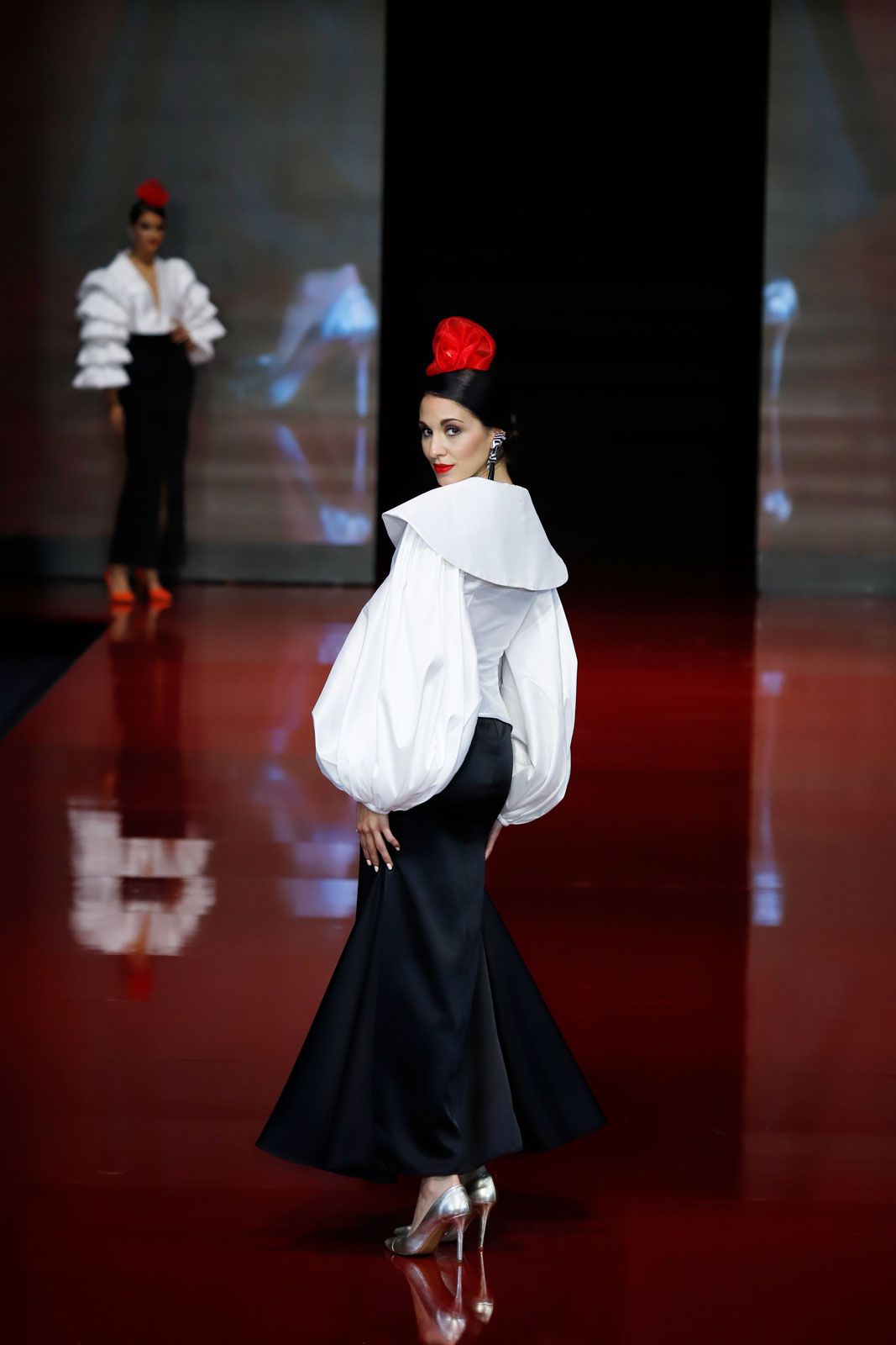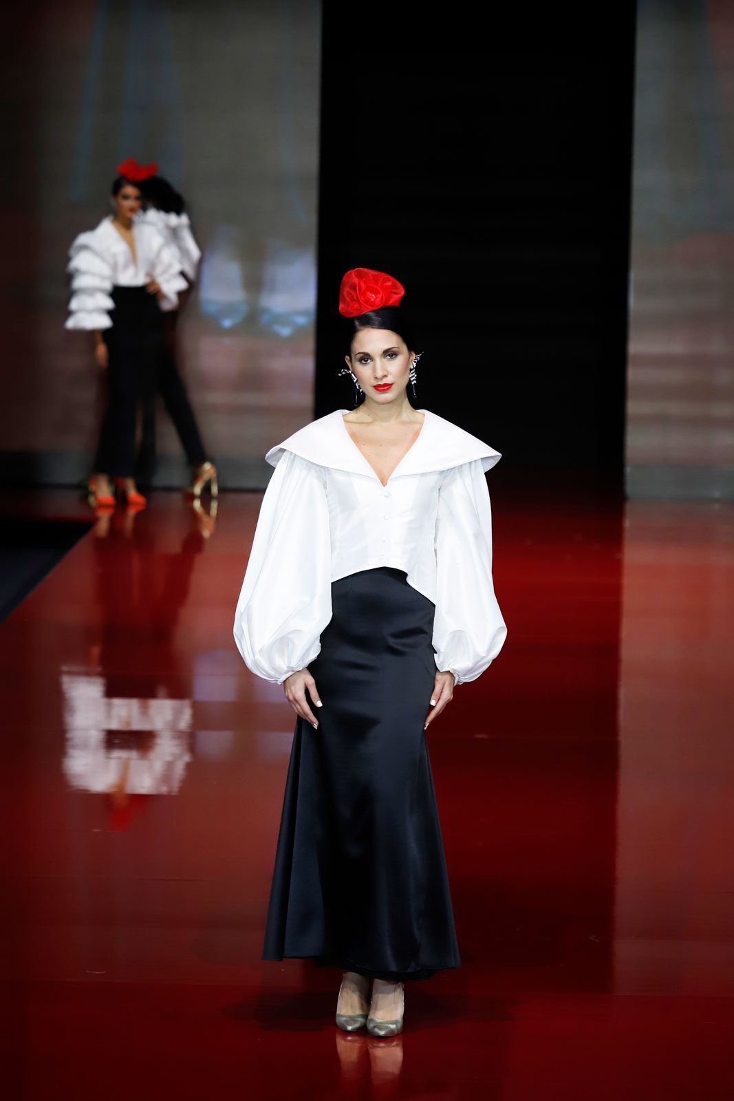 Camisa de cuello smokin y falda de tubo con godets en los laterales