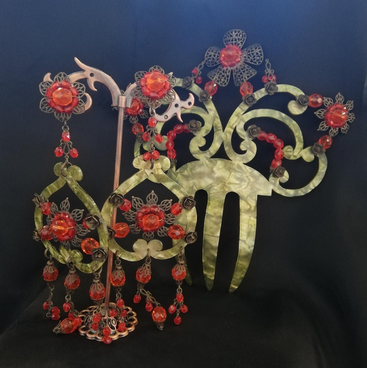 Pendientes de flamenca de carey verde y cristal coral. Peineta a juego.