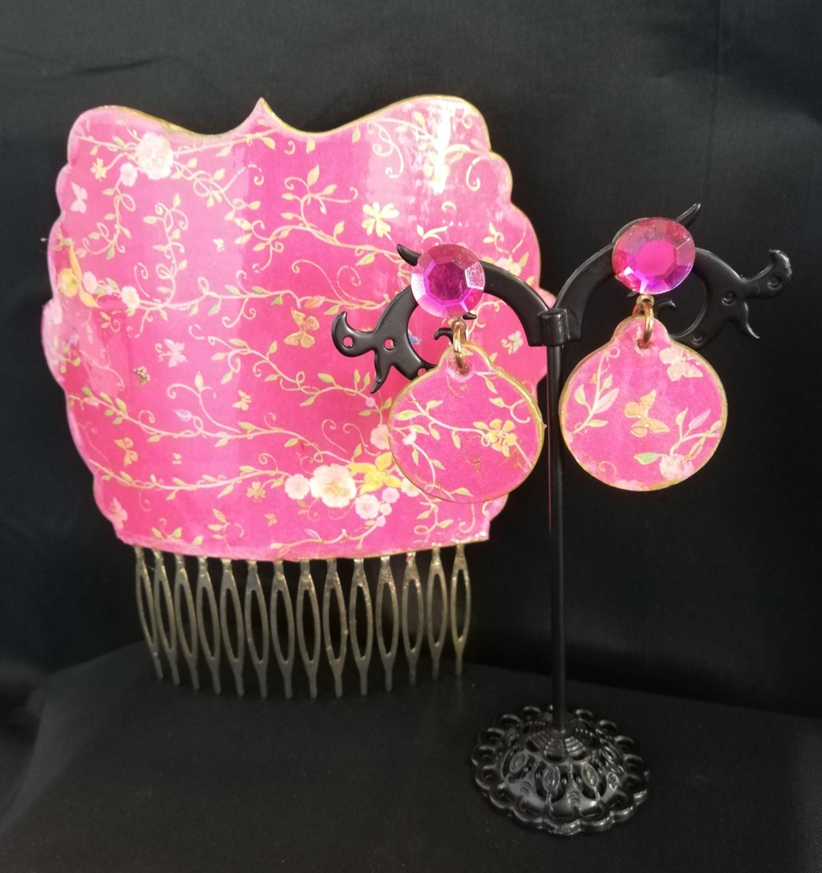 Peineta de flamenca de Arte Peinas y pendientes pequeños a juego. Fucsia con estampado floral.