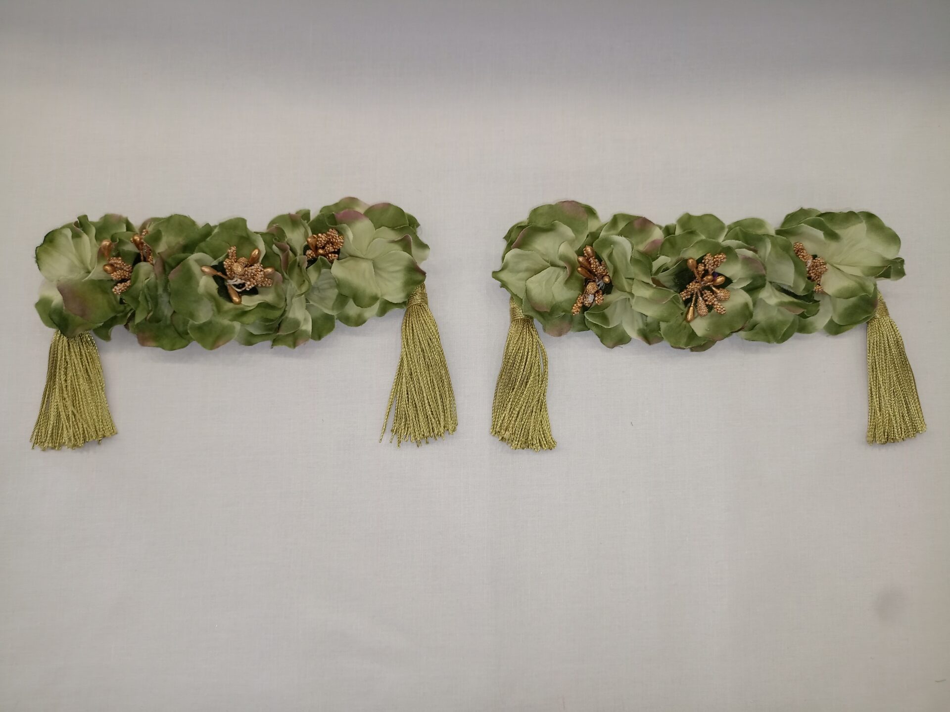 Hombrera de flamenca pequeña en tonos verdes con una borla de flecos en cada extremo.