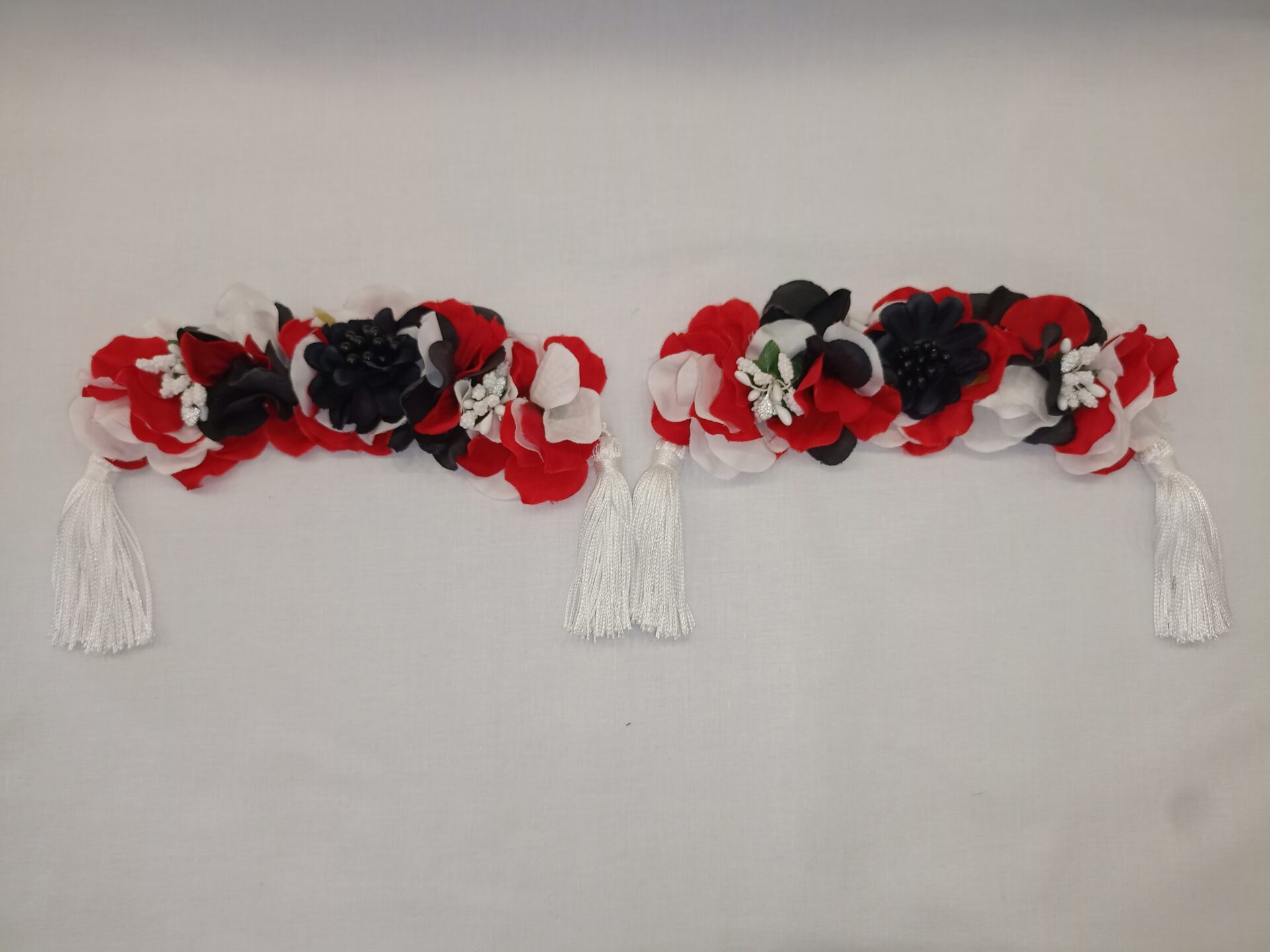 Hombrera de flamenca pequeña en tonos combinados rojos y negros con una borla de flecos en cada extremo.
