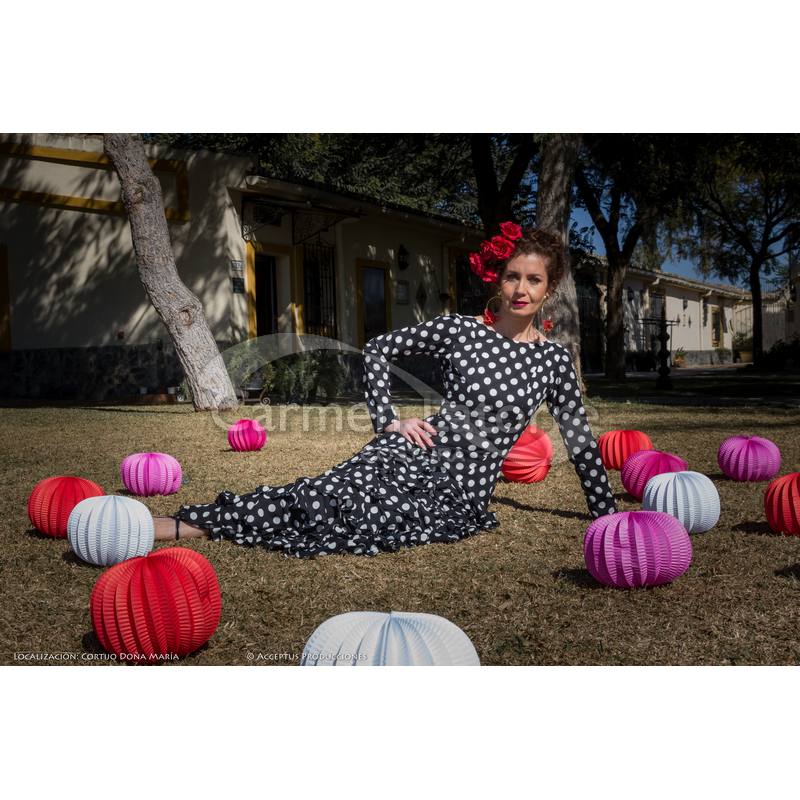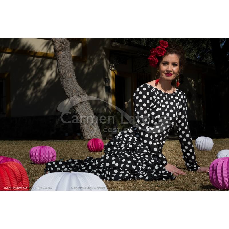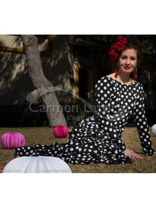 Es un traje de flamenca realizado en geortte de seda, para ir de noche a la feria, ideal para el pescaíto, o incluso para una boda. Como puede verse es un vestido de flamenca muy cómodo, con volantes desde la alta cadera, que estilizan el cuerpo. Es parte de una colección muy particular, para una mujer que quiere ir con un aire flamenco a algún evento, pero sin llegar a ser el traje de flamenca propiamente dicho.