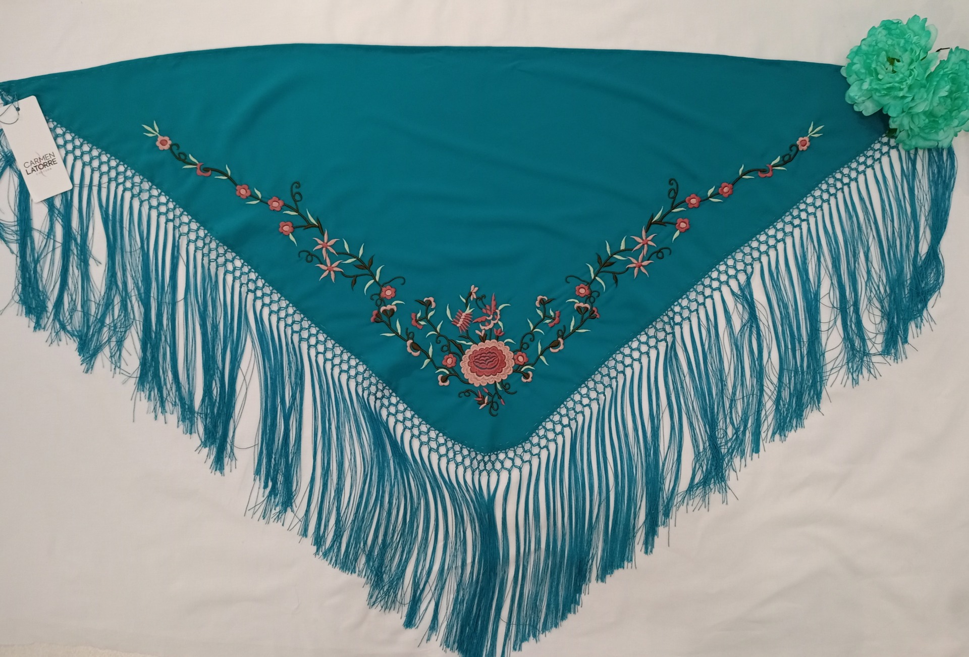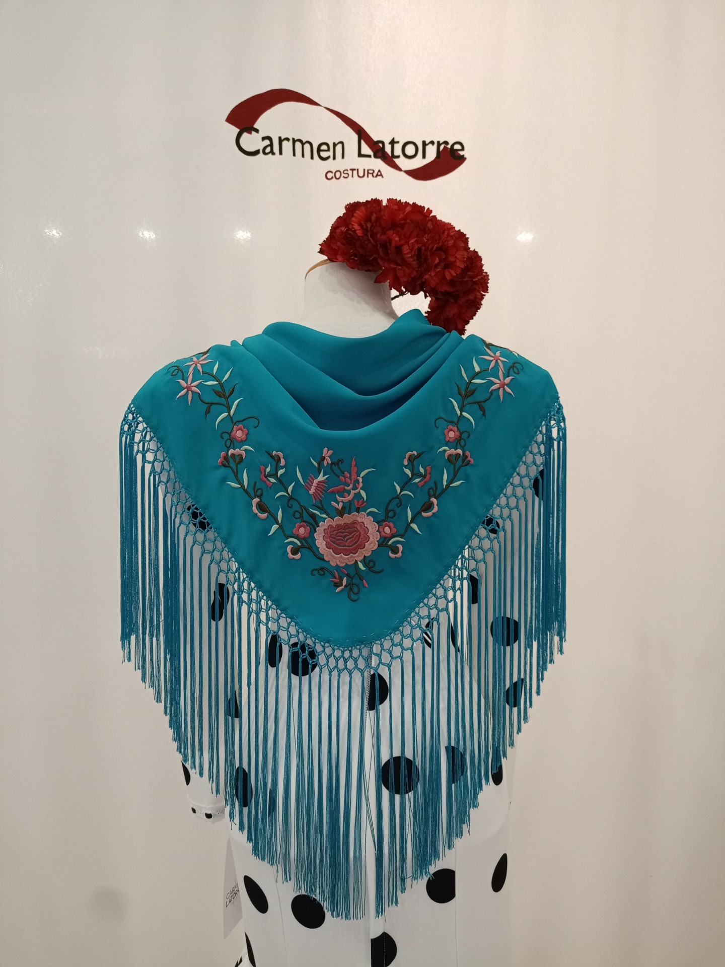 Mantoncillo de señora agua marina, modelo mariposa con bordados en tonos rosas y verdes.