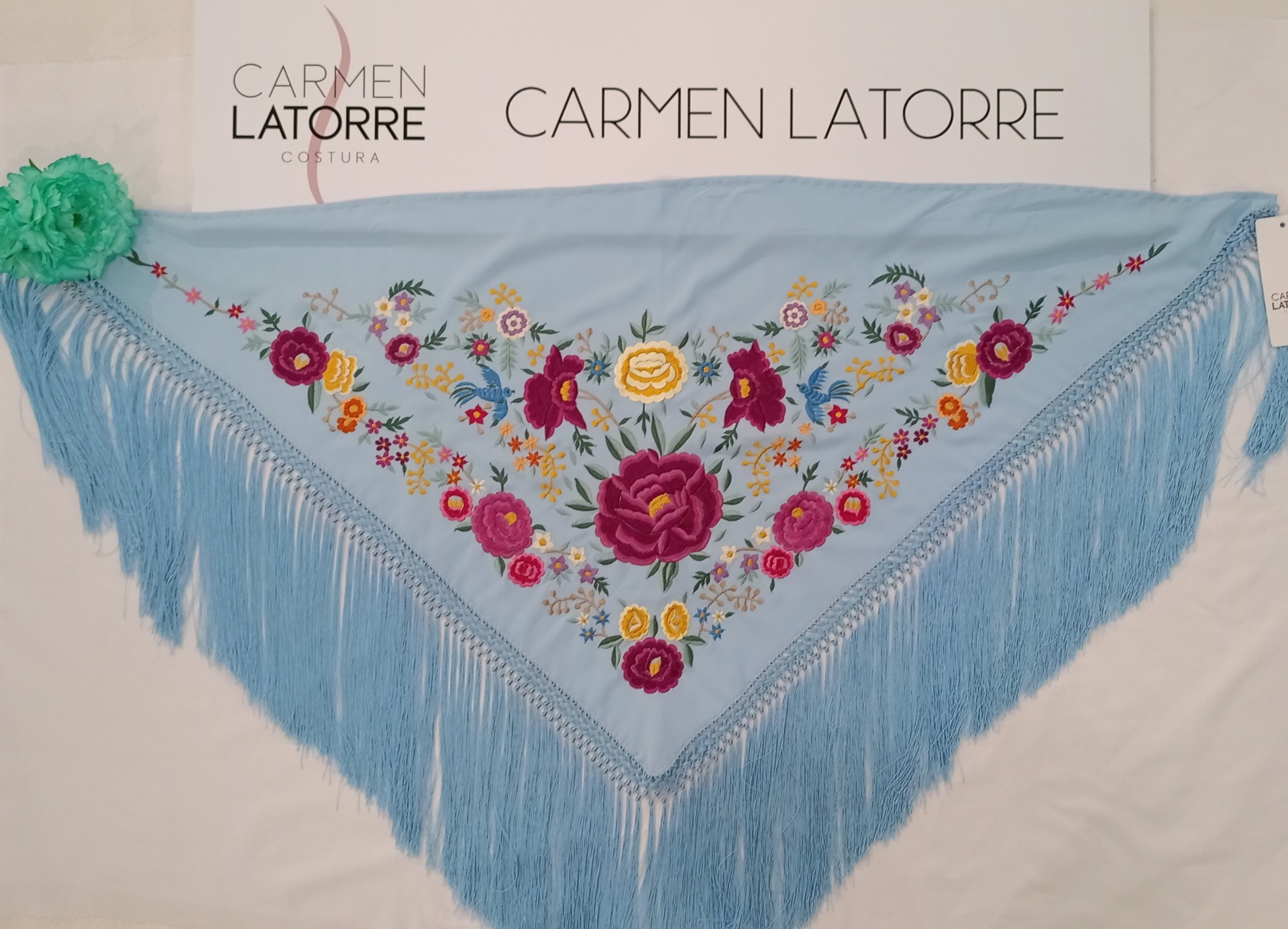 Mantoncillo de señora azul celeste, modelo Alcor con bordados en tonos variados.