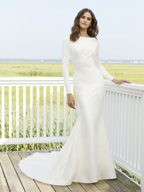 El modelo Fauna de Morilee Garden es un vestido de corte sirena en raso de seda, ideal para novias que aprecian la elegancia atemporal. Su escote barco resalta los hombros con distinción, mientras que la espalda en V profunda añade sensualidad. Las mangas largas ajustadas con botonadura estilizan la figura, y la cola media completa un diseño equilibrado y sofisticado.