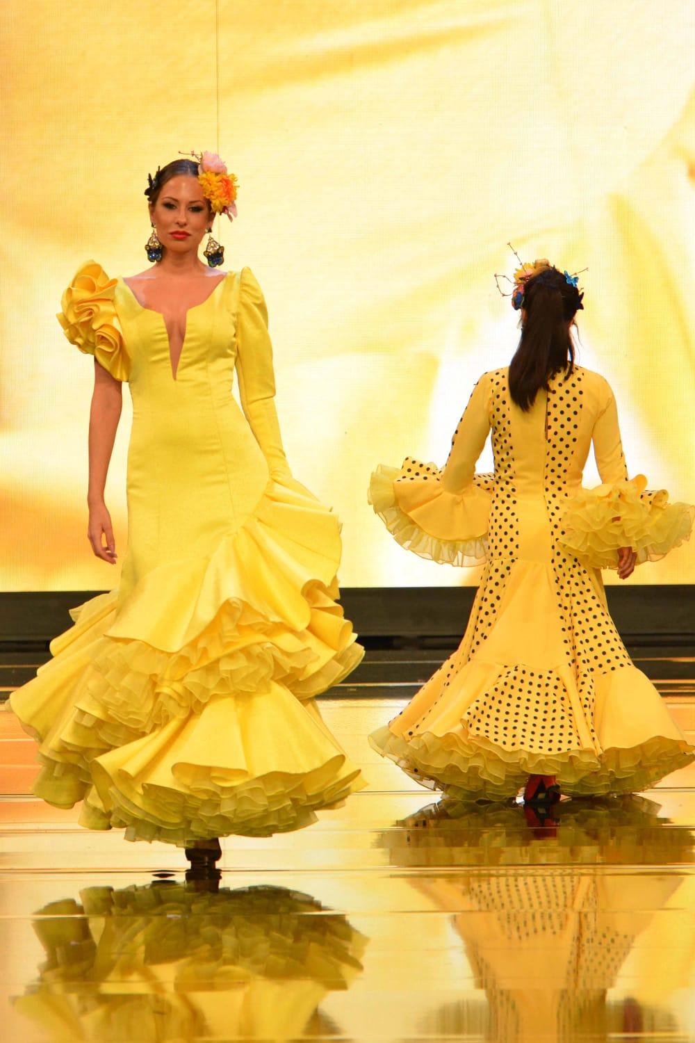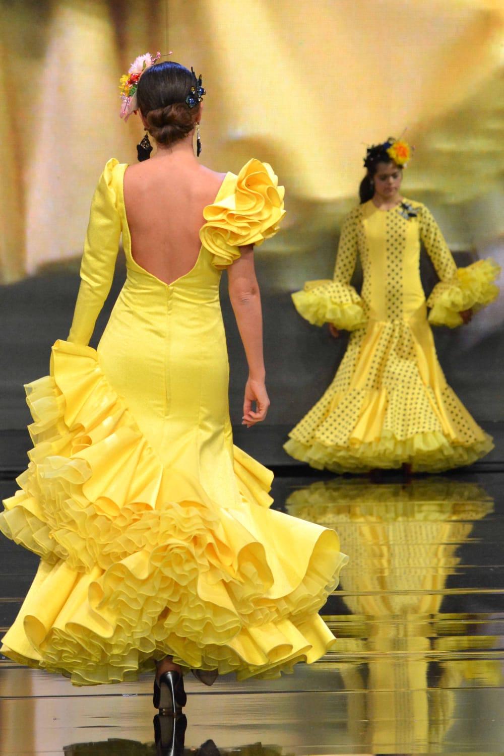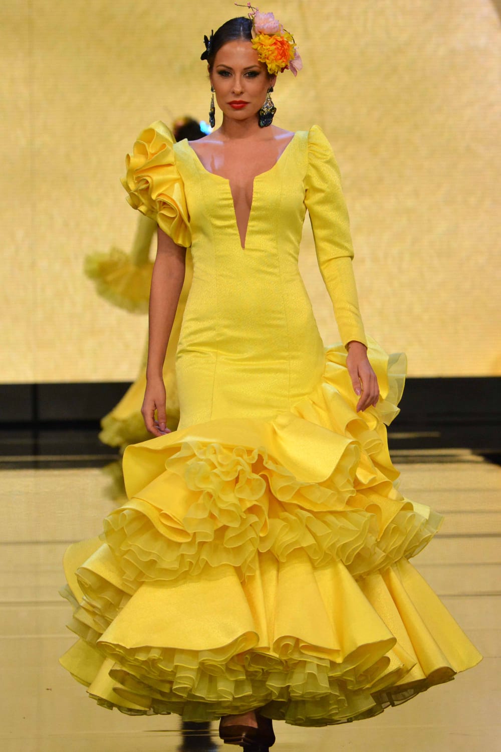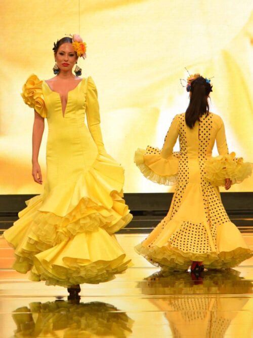 Vestido de flamenca en color amarillo intenso confeccionado con doble volante en la falda. Con subida de un tercer volante y mangas asimétricas.