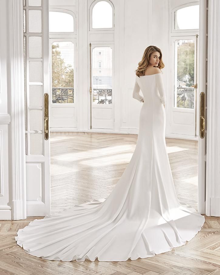Escote: Tipo bañera, con hombros al descubierto. Como adorno, solo una puntilla de guipur al borde.