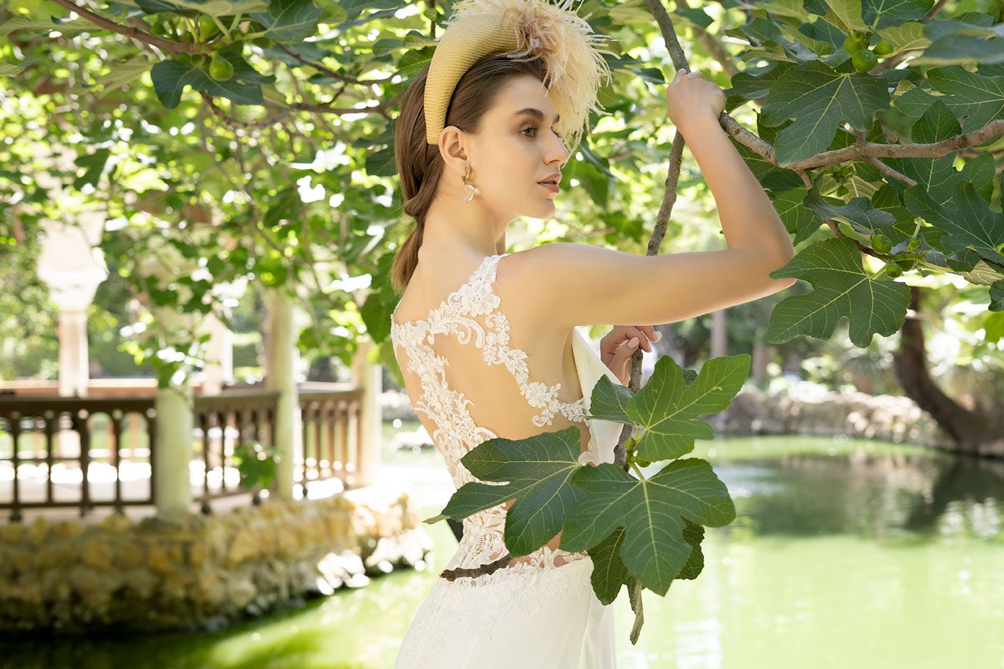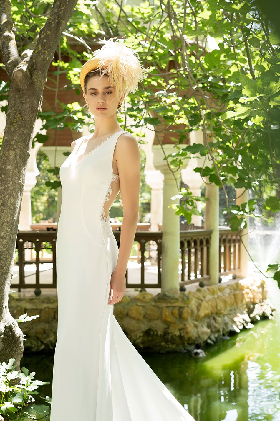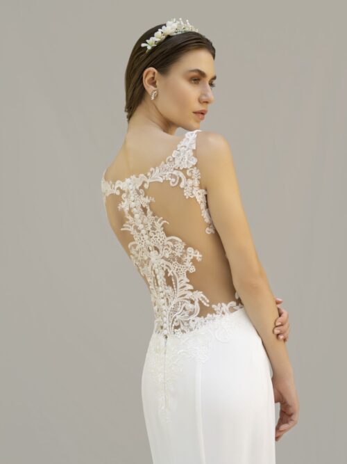 Vestido en crec de satén de licra, de línea sirena, con escote de pico muy favorecedor y puntilla de guipur bordeando el escote de delante, detrás la técnica tantoo donde un tul transparente hasta la cintura elabora un bordado en con motivos de hojas y botonadura hasta la cadera. Posibilidad de ponerle mangas y con una maxi-cola de 2,5 mts. Con posibilidad de acortarla.