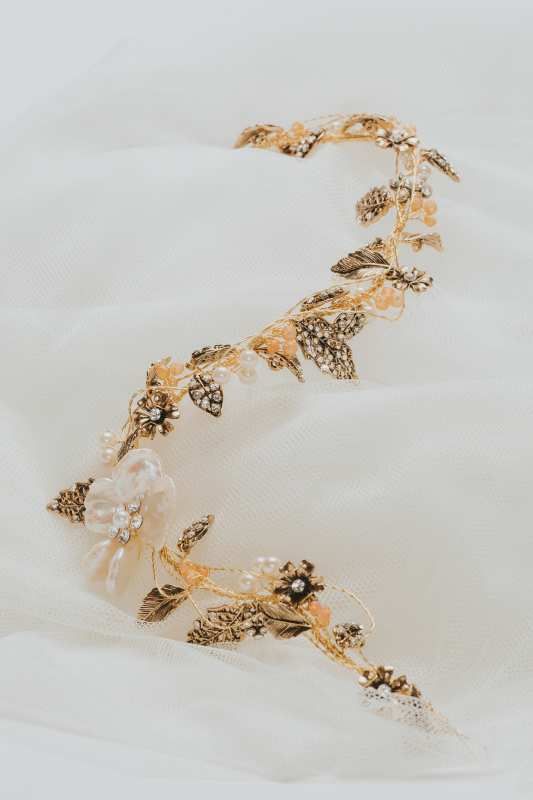 Tocado flexible en oro viejo y nácar con distinta tonalidades