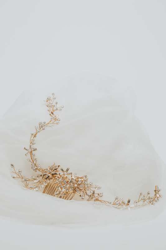 Tocado en dorado y cristal flexible.