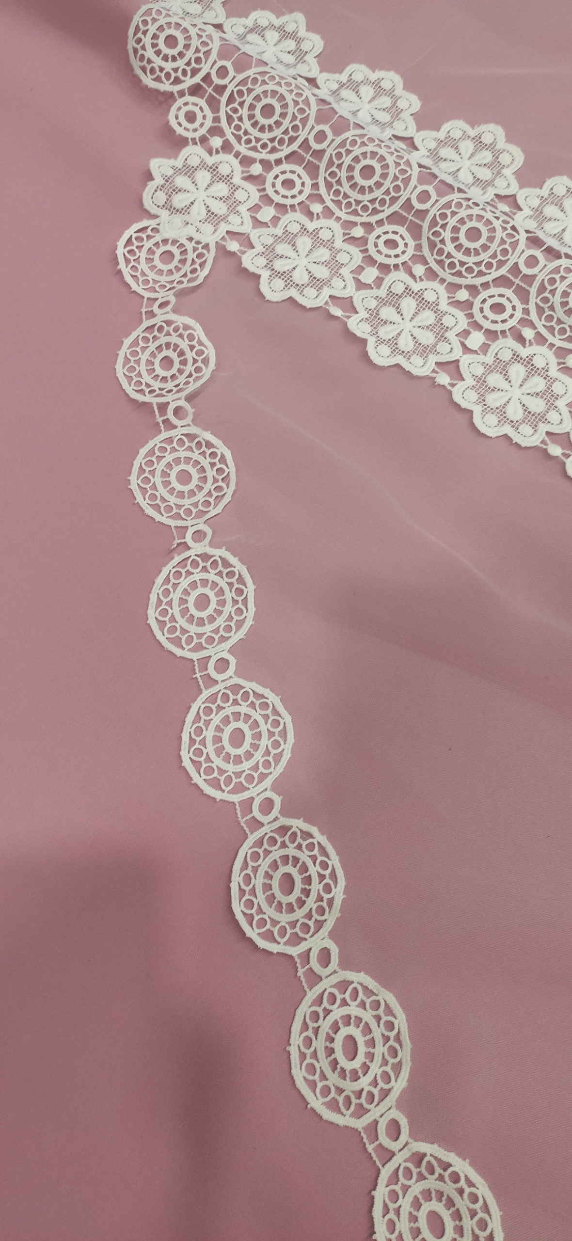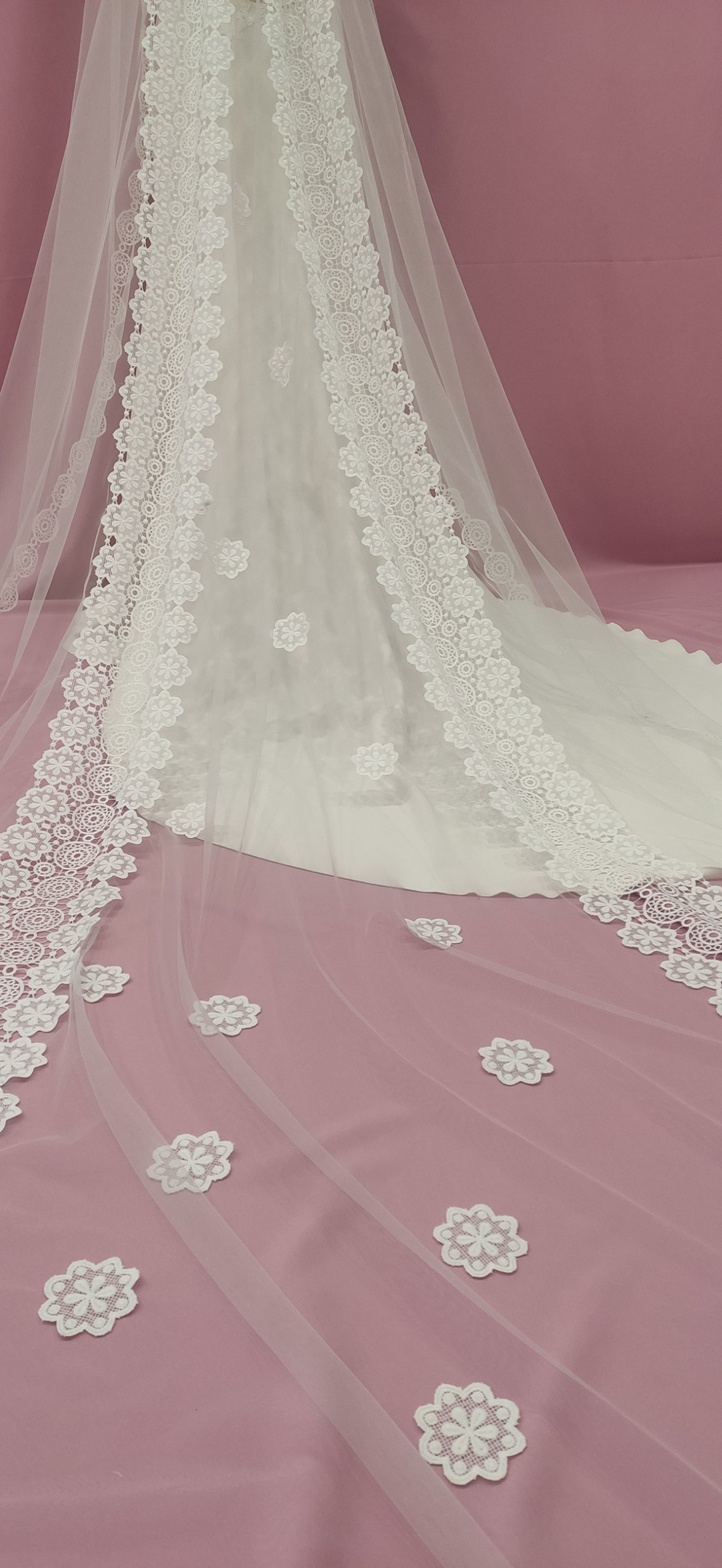Velo de seda mórbido con cenefas de guipur y flores sueltas, blanco roto. Medidas: 2×3,5