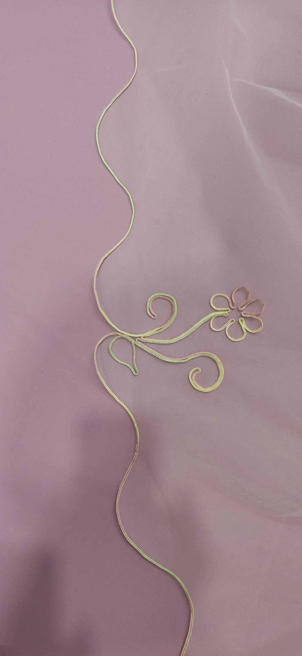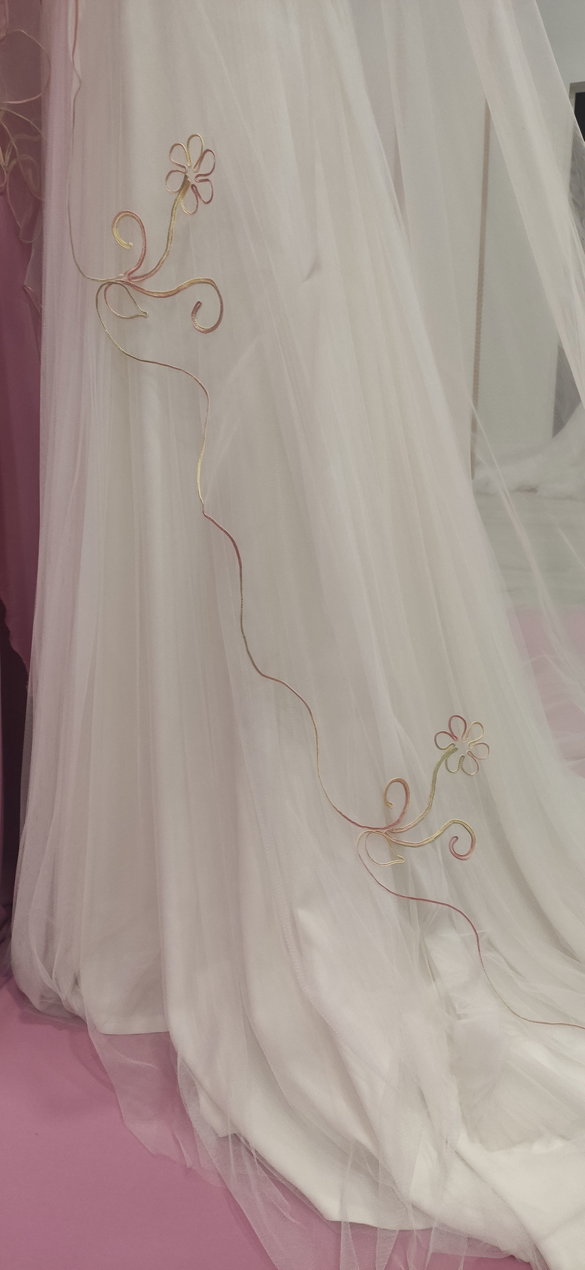 Velo ilusión en marfil con galón en colores rosa, amarillo y verde claro. Medidas: 3×3,5