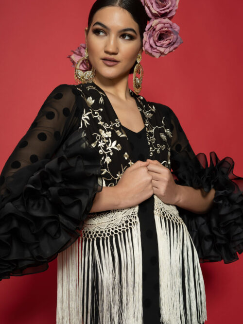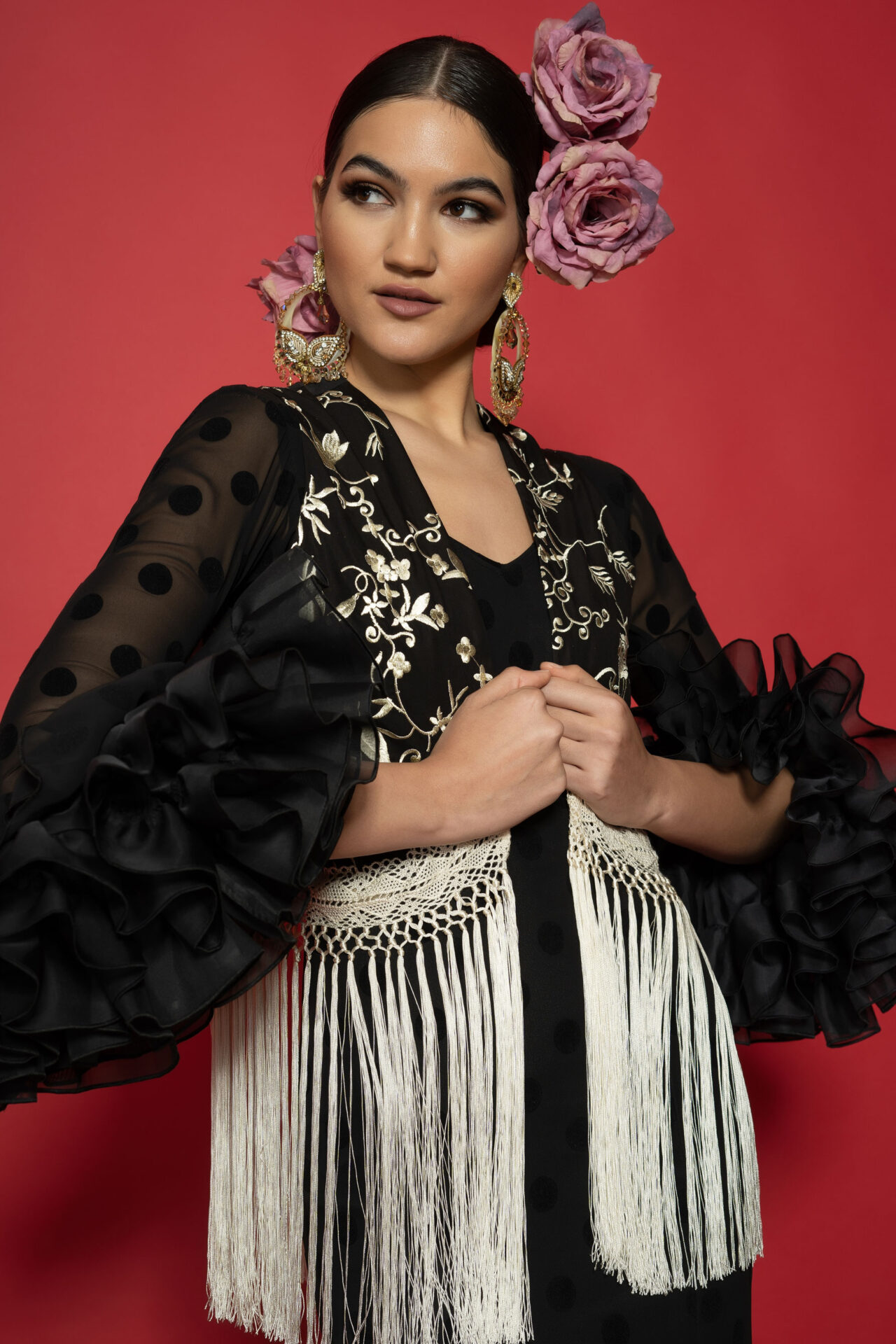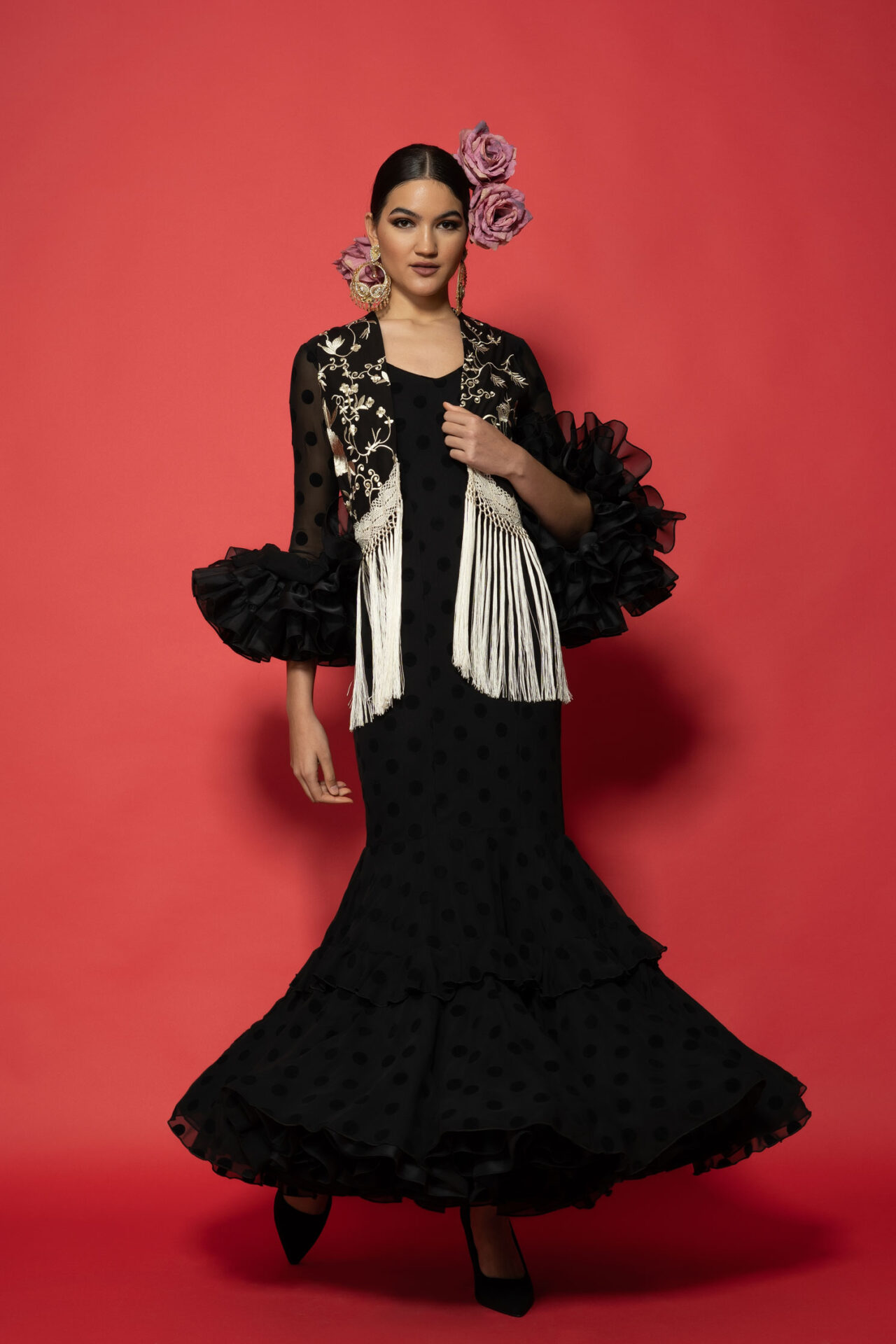 Vestido de flocado de gasa negro con falda de capa baja y volante de capa pequeño y otro de mayor tamaño, enaguas de clavel y chaleco bordado independiente su precio del chaleco con fleco es de 95 €