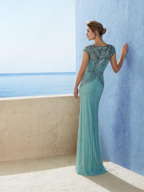 VESTIDO CEREMONIA MANGA LARGA CON ESCOTE BARDOT CON PLUMAS