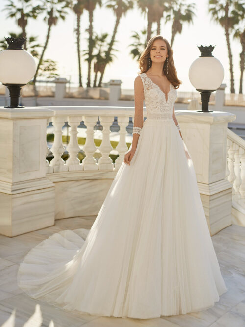 Vestido de novia estilo romántico, de corte princesa con cuerpo de encaje pedrería y falda de tul plumeti, con escote en V, espalda cerrada con tul flocado, botones perla y manga francesa. Modelo Aire Barcelona en tul plumeti y encaje.