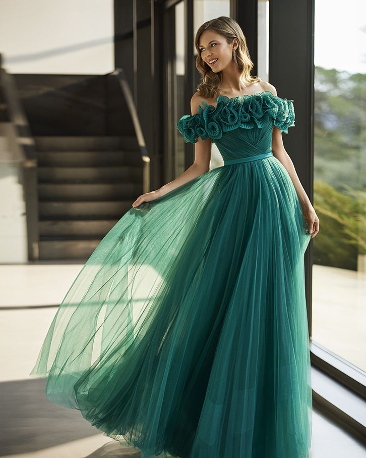 Vestido gasa burdeos con drapeado en el pecho y godets en la falda