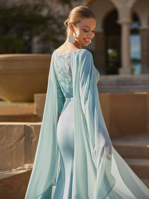 VESTIDO CEREMONIA DE PEDRERÍA Y MANGAS DE CAPA