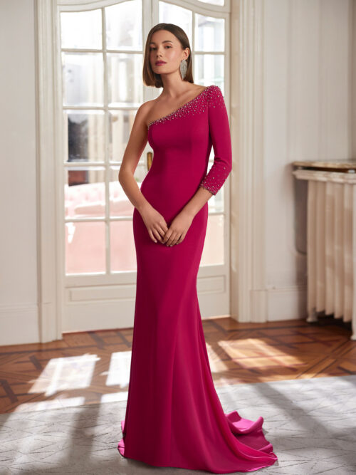 VESTIDO CEREMONIA ESCOTE ASIMETRICO CON FLOR