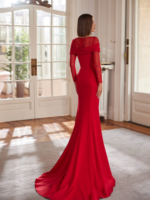 VESTIDO CEREMONIA MANGA LARGA CON ESCOTE BARDOT CON PLUMAS